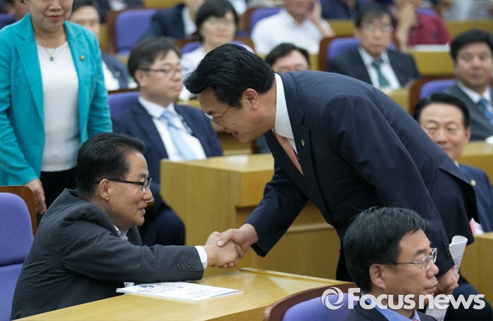 (서울=포커스뉴스) 28일 오후 서울 여의도 국회 의원회관에서 열린 4차 산업혁명포럼 창립총회에 참석한 정진석(오른쪽) 새누리당 원내대표가 축사를 마친 뒤 퇴장하며 박지원 국민의당 원내대와 인사하고 있다. 이날 창립한 포럼은 여야 3당 비례대표 1번인 송희경 새누리당 의원, 박경미 더불어민주당 의원, 신용현 국민의당 의원을 주축으로 구성된 포럼이다.
