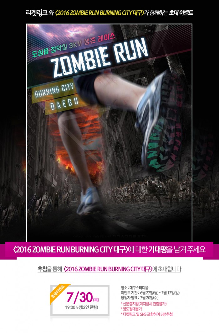 (서울=포커스뉴스) NHN티켓링크(대표 양주일)는 다음달 30일 대구 스타디움에서 개최되는 '2016 좀비런 버닝시티'(ZOMBIE RUN BURNING CITY, 이하 좀비런) 행사 초대 이벤트를 진행한다고 28일 밝혔다.