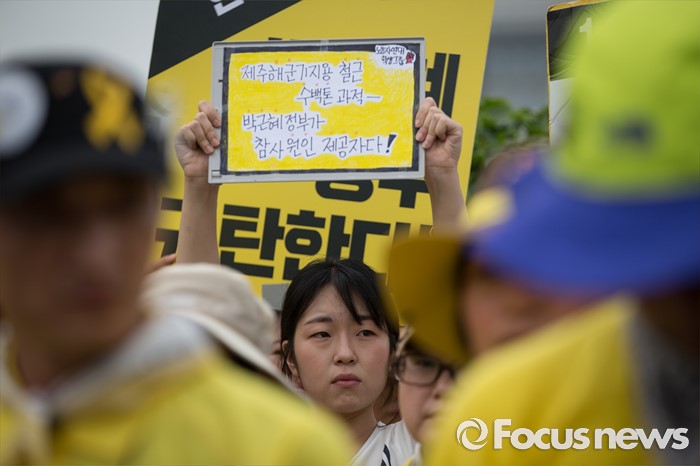 (서울=포커스뉴스) 416가족협의회와 4월16의약속국민연대가 28일 오후 서울 여의도 국회 앞에서 20대 국회, 6월 임시국회에 세월호 특별법 개정을 촉구하는 기자회견을 하고 있다. 회견장에서 노동자 연대 학생그룹의 한 참석자가 박근혜 정부를 규탄하는 피켓을 들고 서 있다.