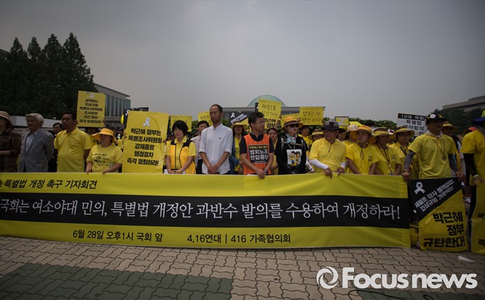 (서울=포커스뉴스) 416가족협의회와 4월16의약속국민연대가 28일 오후 서울 여의도 국회 앞에서 '20대 국회 6월 임시국회에 특별법 개정 촉구' 기자회견을 하고 있다.