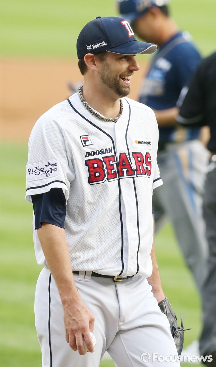 (서울=포커스뉴스) 28일 서울 잠실구장에서 열린 2016 프로야구 NC-두산 경기에서 두산 선발투수 니퍼트가 1회초 수비를 마치고 덕아웃으로 들어가며 활짝 웃고 있다.