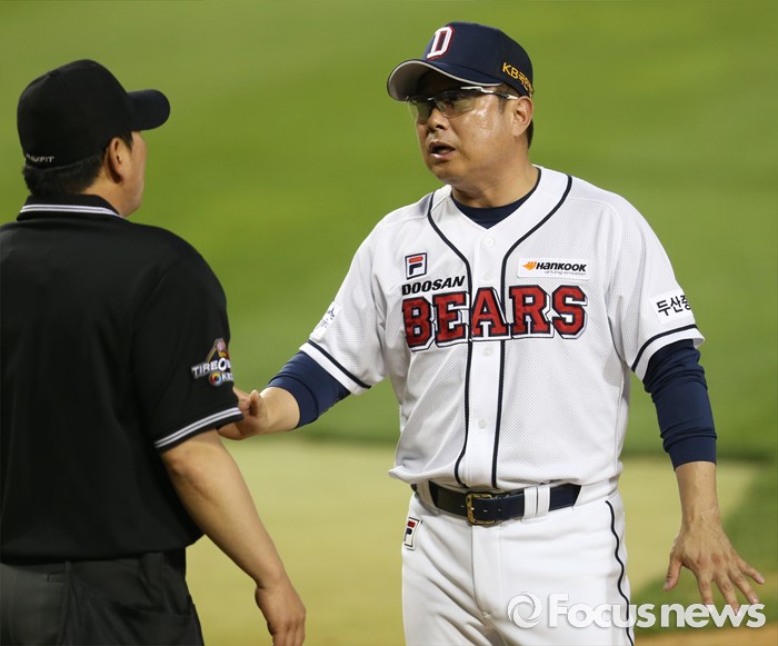 (서울=포커스뉴스) 28일 서울 잠실구장에서 열린 2016 프로야구 NC-두산 경기 5회초 두산 김태형 감독이 김성철 주심에게 스트라이크존에 대해 어필하고 있다.