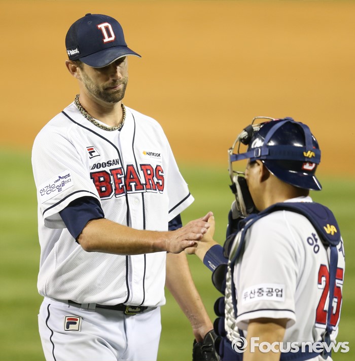 (서울=포커스뉴스) 28일 서울 잠실구장에서 열린 2016 프로야구 NC-두산 경기에서 두산 투수 니퍼트가 6회 투구를 마치고 덕아웃으로 들어가며 포수 양의지와 손을 마주치고 있다.