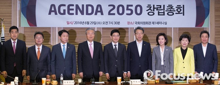 (서울=포커스뉴스) 29일 오전 서울 여의도 국회 의원회관에서 열린 아젠다 2050 창립총회에 참석한 의원들이 기념촬영을 하고 있다. 왼쪽부터 오신환 새누리당 의원, 이철희, 조정식 더불어민주당 의원, 김종인 비대위 대표, 김세연 새누리당 의원, 김성식 국민의당 정책위의장, 나경원, 박인숙, 이학재 새누리당 의원.