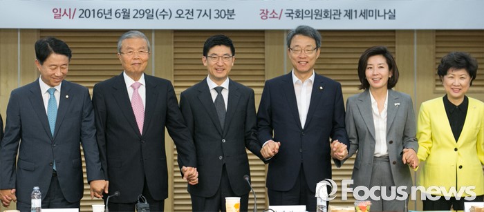 (서울=포커스뉴스) 29일 오전 서울 여의도 국회 의원회관에서 열린 아젠다 2050 창립총회에 참석한 의원들이 기념촬영을 하고 있다. 왼쪽부터 조정식 더불어민주당 의원, 김종인 비대위 대표, 김세연 새누리당 의원, 김성식 국민의당 정책위의장, 나경원, 박인숙 새누리당 의원.