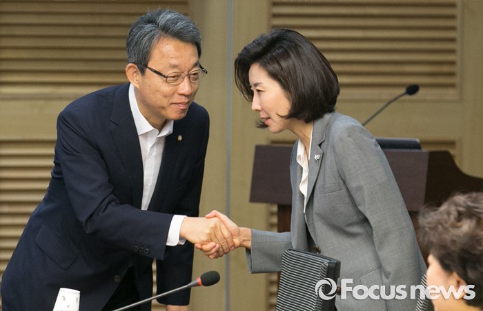 (서울=포커스뉴스) 29일 오전 서울 여의도 국회 의원회관에서 열린 아젠다 2050 창립총회에 참석한 나경원(가운데) 새누리당 의원과 김성식(왼쪽) 국민의당 정책위의장이 인사하고 있다.