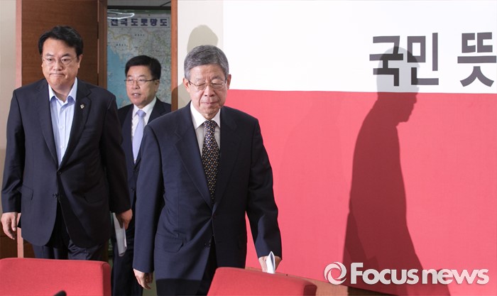 (서울=포커스뉴스) 김희옥(오른쪽부터) 새누리당 혁신비상대책위원장, 김광림 정책위의장, 정진석 원내대표가 29일 오전 서울 여의도 당사에서 열린 혁신비대위원회의에 참석하고 있다.