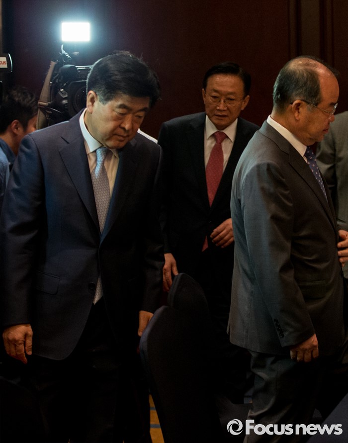 (서울=포커스뉴스) 29일 오전 서울 강남구 그랜드 인터콘티넨탈 호텔에서 열린 산업부 주최 조선업계 CEO ·전문가 간담회에 참석한 권오갑(왼쪽부터) 현대중공업 사장, 박대영 삼성중공업 사장, 정성립 대우조선해양 사장이 기념촬영 후 착석하고 있다.