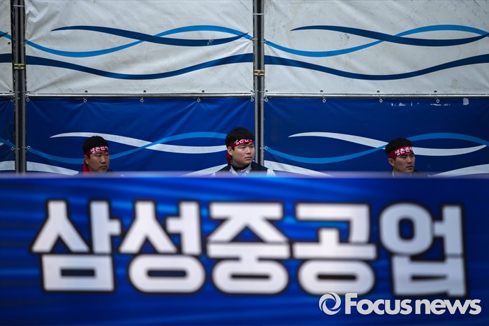 (서울=포커스뉴스) 29일 오전 서울 서초구 삼성 사옥 앞에서 삼성중공업 노동협의회 관계자들이 구조조정에 반대하는 시위를 하고 있다. 삼성중공업은 지난 15일 임원들의 임금 반납, 희망퇴직 등이 포함된 구조조정안을 공개했으며 올해 약 1500명 규모의 희망퇴직을 단행할 계획이라 밝혔다.