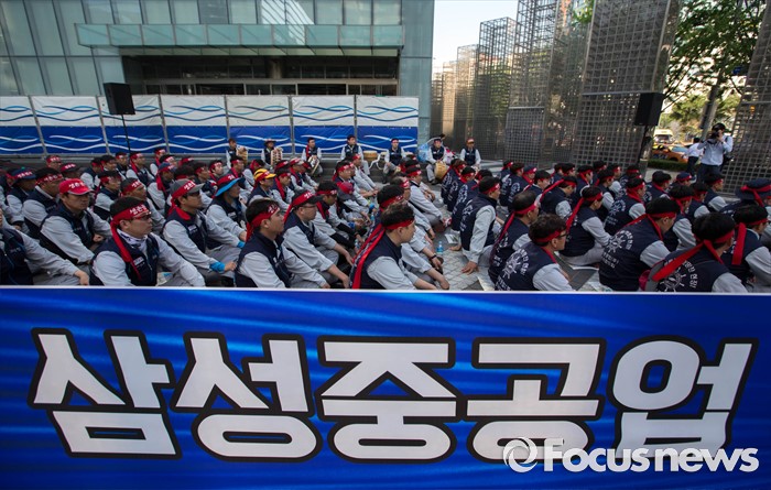 (서울=포커스뉴스) 29일 오전 서울 서초구 삼성 사옥 앞에서 삼성중공업 노동협의회 관계자들이 구조조정에 반대하는 시위를 하고 있다. 삼성중공업은 지난 15일 임원들의 임금 반납, 희망퇴직 등이 포함된 구조조정안을 공개했으며 올해 약 1500명 규모의 희망퇴직을 단행할 계획이라 밝혔다.