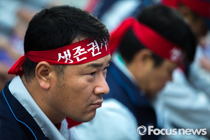 (서울=포커스뉴스) 29일 오전 서울 서초구 삼성 사옥 앞에서 삼성중공업 노동협의회 관계자들이 구조조정에 반대하는 시위를 하고 있다. 삼성중공업은 지난 15일 임원들의 임금 반납, 희망퇴직 등이 포함된 구조조정안을 공개했으며 올해 약 1500명 규모의 희망퇴직을 단행할 계획이라 밝혔다.