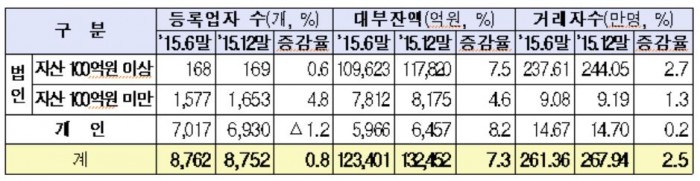 대형 대부업체에 몰리는 돈도 늘어나고 '이자 장사'가 되자 차입금 규모도 대폭 늘렸다. 이 업체들은 작년 하반기 7조8282억원의 차입금을 조달했다. 작년 상반기 7조518억원에 비해 7764억원(11%)나 늘어난 숫자다.
