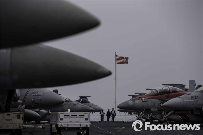 한미일 군당국은 30일부터 시작되는 림팩(27개 태평양 연안국 연합 훈련)에 앞서 한미일 별도로 탄도미사일 추적능력 향상을 위한 미사일 경보연습 훈련을 실시했다. 북한 미사일 탐지 훈련을 한미일이 공동으로 벌인 것은 이번이 처음으로 이번 훈련에는 한미일 3국의 이지스함이 모두 투입된 것으로 알려졌다.(부산=포커스뉴스) 13일 오후 부산 남구에 위치한 해군작전사령부에 입항한 존 C. 스테니스 핵항모가 취재진에게 공개되었다. 키리졸브 독수리 훈련에 참가하기 위해 한국을 찾은 스테니스항모는 길이 333m, 폭 78m,탑승 승조원은 6500명에 달하는 미 해군 핵심항모 중 하나다. 주기되어 있는 전투기들 사이로 함대기가 보인다. 2016.03.13 서영걸 기자