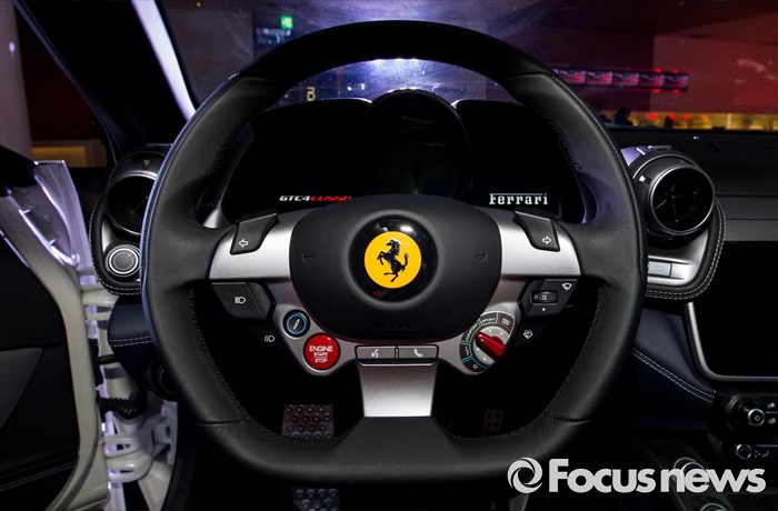 (서울=포커스뉴스) 29일 오전 서울 광진구 W서울 워커힐 호텔에서 이탈리아 스포츠카 브랜드 페라리가 'GTC4 루쏘(GTC4Lusso)'를 선보이고 있다. 사진은 신차의 핸들 모습.