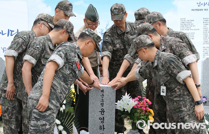 (대전=포커스뉴스) 제2연평해전 14주기를 맞은 29일 오전 대전 유성구 국립대전현충원 제2연평해전 전사자 묘역에서 故 윤영하 소령의 해군사관학교 50기 동기생들이 추모하고 있다.