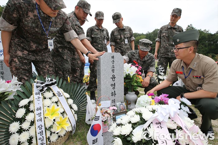 (대전=포커스뉴스) 제2연평해전 14주기를 맞은 29일 오전 대전 유성구 국립대전현충원 제2연평해전 전사자 묘역에서 故 윤영하 소령의 해군사관학교 50기 동기생들이 추모하며 묘비를 닦고 있다.