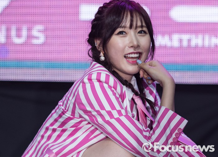 (서울=포커스뉴스) 29일 오전 서울 마포구 예스24 무브홀에서 열린 걸그룹 소나무의 미니앨범 '넘나 좋은 것' 쇼케이스에 참여한 멤버 의진이 포토타임을 갖고 있다.