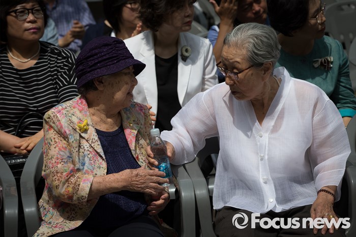 (서울=포커스뉴스) 29일 오전 서울 중구 예장동 옛 통감관저 터에서 열린 일본군 위안부 피해자 추모공원 '기억의 터' 기공식에 참석한 김복동(오른쪽) 할머니가 길원옥 할머니에게 물을 전하고 있다.