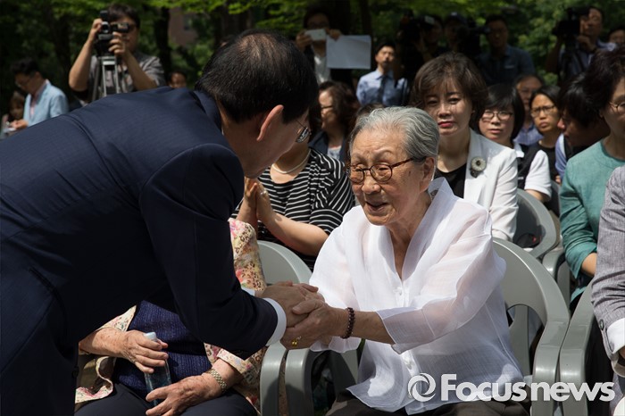 (서울=포커스뉴스) 29일 오전 서울 중구 예장동 옛 통감관저 터에서 열린 일본군 위안부 피해자 추모공원 '기억의 터' 기공식에 참석한 박원순 서울시장이 김복동 할머니와 악수하고 있다.