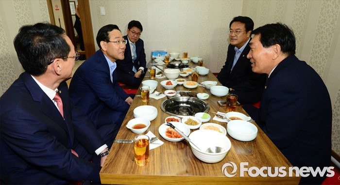 (서울=포커스뉴스) 정진석 새누리당 원내대표가 29일 오후 서울 여의도 한 음식점에서 열린 복당 의원들과의 오찬에 참석해 의원들과 대화하고 있다. 왼쪽부터 김도읍 원내수석부대표, 주호영, 장제원 의원, 정 원내대표, 안상수 의원.