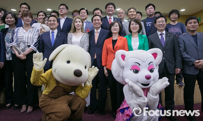 (서울=포커스뉴스) 29일 오후 서울 여의도 국회 의원회관에서 열린 동물복지포럼 출범식에 참석한 우상호 더불어민주당 원내대표, 이정미 정의당 원내수석부대표, 가수 배다해, 다나 등 의원 및 참석자들이 기념촬영을 하고 있다.