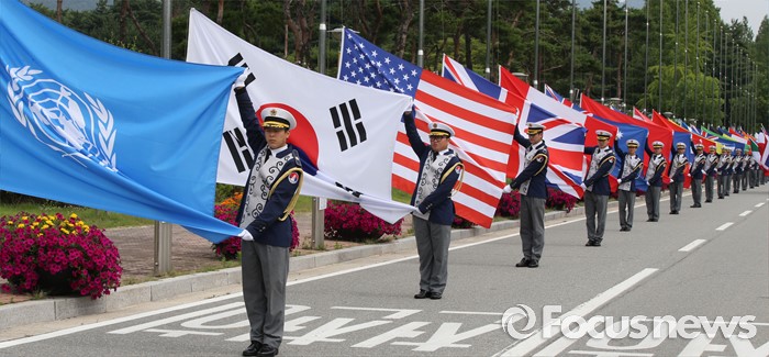 (대전=포커스뉴스) 29일 오전 대전 유성구 국립대전현충원에서 열린 제3회 유엔참전국 국기 게양식에서 의전단이 6·25 전쟁 참전국 국기를 깃대에 걸고 있다.