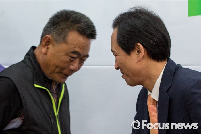 (서울=포커스뉴스) 우상호 더불어민주당 원내대표가 29일 오후 서울 여의도 국회에서 열린 '서해 5도 중국어선 불법조업 대책 마련 및 해양주권 수호 위안 협약식'에 참석한 박태원 연평도 어촌계장과 인사 하고 있다.