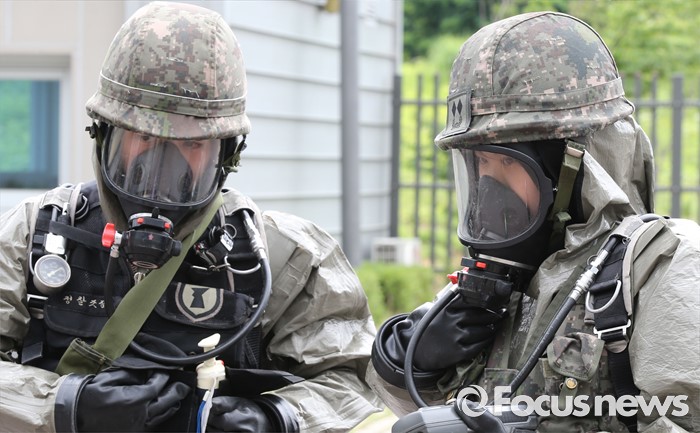 (세종=포커스뉴스) 29일 오후 세종시 정부세종청사경비대에서 열린 적 특수전부대원 침투 및 화학폭탄 폭발 대응 민·관·군·경 합동 민방위훈련에서 32시단 화학대대 병력들이 화학폭발물 수거를 하고 있다.