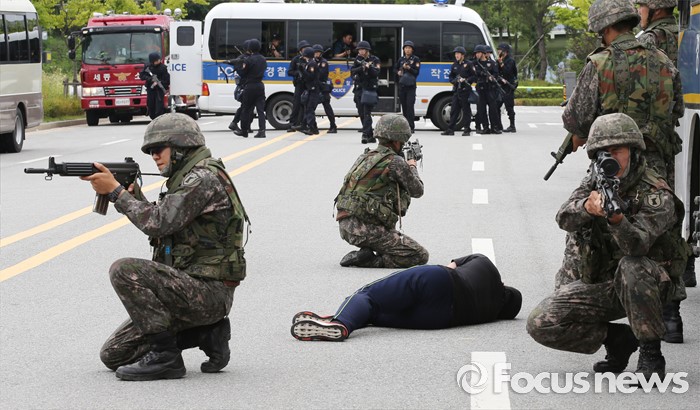 (세종=포커스뉴스) 29일 오후 세종시 정부세종청사경비대에서 열린 적 특수전부대원 침투 및 화학폭탄 폭발 대응 민·관·군·경 합동 민방위훈련에서 32시단 병력과 경력이 테러범을 소탕하고 있다.