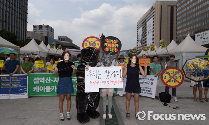 (서울=포커스뉴스) 설악산국립공원지키기국민행동 등 환경단체가 29일 오후 서울 광화문광장에서 설악산-지리산국립공원 케이블카추진 공동 규탄 기자회견 중 산양과 반달곰을 포박하는 퍼포먼스를 펼치고 있다.