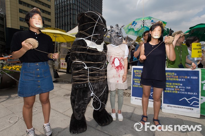 (서울=포커스뉴스) 설악산국립공원지키기국민행동 등 환경단체가 29일 오후 서울 광화문광장에서 설악산-지리산국립공원 케이블카추진 공동 규탄 기자회견 중 산양과 반달곰을 포박하는 퍼포먼스를 펼치고 있다.
