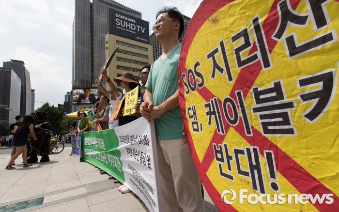 (서울=포커스뉴스) 설악산국립공원지키기국민행동 등 환경단체가 29일 오후 서울 광화문광장에서 설악산-지리산국립공원 케이블카추진 공동 규탄 기자회견을 하고 있다.