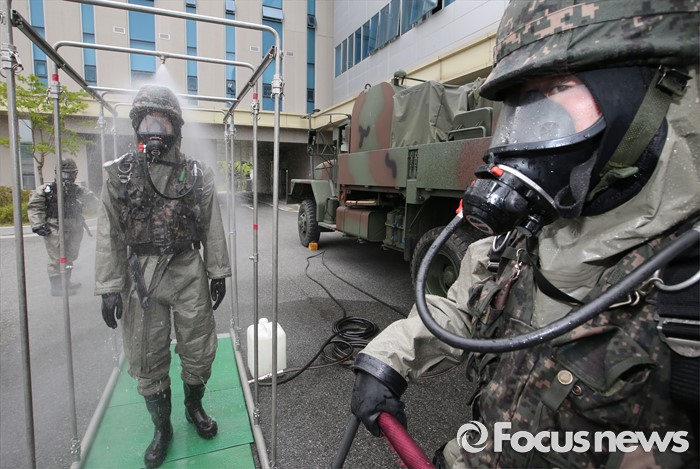 (세종=포커스뉴스) 29일 오후 세종시 정부세종청사경비대에서 열린 적 특수전부대원 침투 및 화학폭탄 폭발 대응 민·관·군·경 합동 민방위훈련에서 32시단 화학대대 병력들이 화학폭발물 수거를 마치고 제독하고 있다.