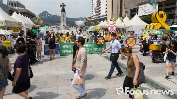 (서울=포커스뉴스) 설악산국립공원지키기국민행동 등 환경단체가 29일 오후 서울 광화문광장에서 설악산-지리산국립공원 케이블카추진 공동 규탄 기자회견을 하고 있다.