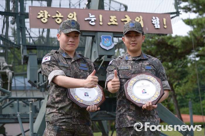 (서울=포커스뉴스) 29일 경기 공군 오산기지에서 방공관제사령관 주관으로 열린 2016 공중전투 요격관제대회 시상식에서 '골든아이'로 선정된 임병진(왼쪽) 중위와 손진호 대위가 상패와 함께 포즈를 취하고 있다. <사진제공=공군>