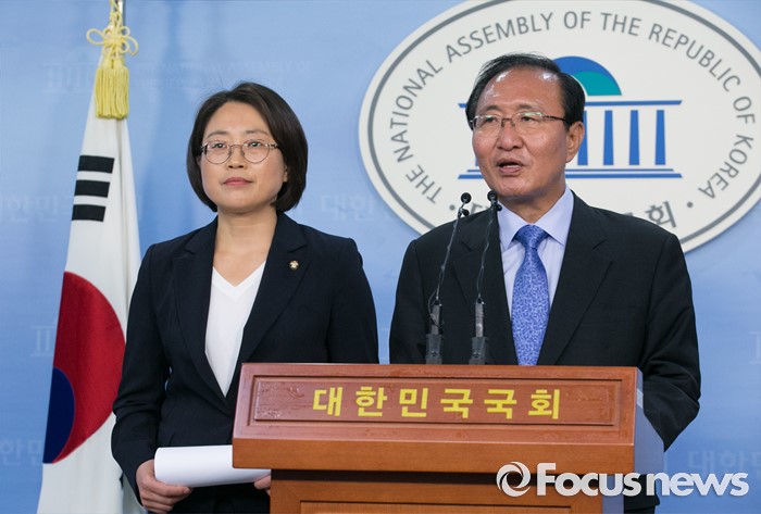 (서울=포커스뉴스) 29일 오후 서울 여의도 국회 정론관에서 미래창조과학방송통신위원회 재배정을 요구하며 농성에 들어갔던 추혜선(왼쪽) 정의당 의원과 노회찬 원내대표가 농성을 해제하고 외교통일위원회 배정을 받아들이는 내용의 기자회견을 하고 있다.