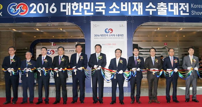 (서울=포커스뉴스) 주형환 산업통상자원부 장관과 이동필 농림축산식품부장관이 29일 서울 강남구 삼성동 코엑스에서 열린 2016 대한민국 소비재 수출대전에 참석해 테이프커팅식을 하고 있다. <사진제공=산업통상자원부>