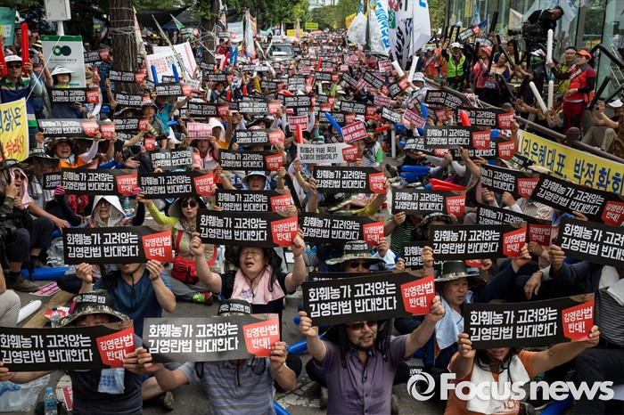 (서울=포커스뉴스) 29일 오후 서울 영등포구 국회의사당 인근에서 전국화훼협회 등 27개 단체원들이 김영란법 반대를 외치며 손펫말을 들고 있다.