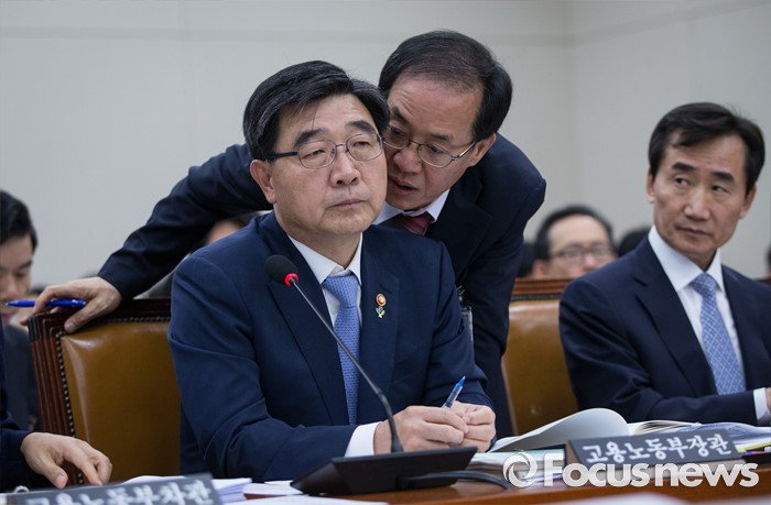 | △ 환노위 전체회의, 귀엣말 듣는 이기권 |