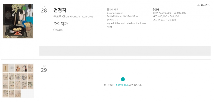 한편 이날 '기행스케치-화문집'와 함께 나온 천 화백의 1994년작 '우수(憂愁)의 티나(추정가 6억8000만~10억 원)'와 1979년작 '오와하까(추정가 7000만~9000만원)' 등 작품 2점은 예정대로 경매에 출품됐다.