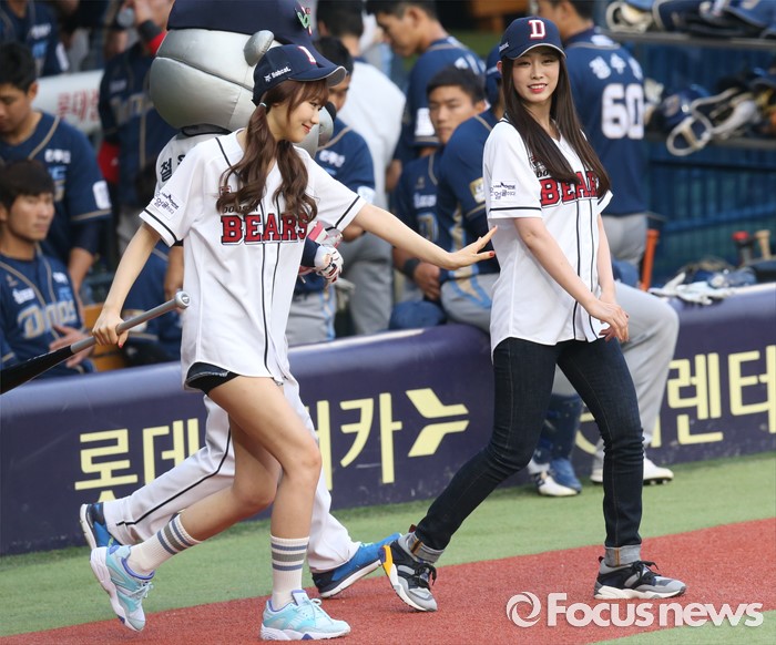 (서울=포커스뉴스) 29일 서울 잠실구장에서 열린 2016 프로야구 NC-두산 경기에서 걸그룹 '러블리즈'의 서지수(오른쪽)와 류수정이 시구, 시타를 위해 그라운드로 나오고 있다.