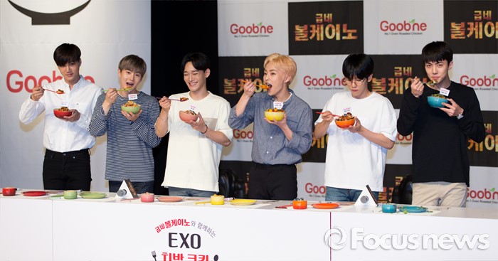 (서울=포커스뉴스) 29일 오후 서울 강남구 일지아트홀에서 열린 '굽네 볼케이노와 함께하는 엑소(EXO) 치밥 쿠킹 팬사인회'에서 카이(왼쪽부터), 수호, 첸, 시우민, 백현, 세훈이 포즈를 취하고 있다.