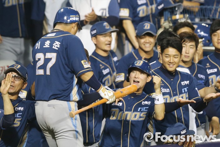 (서울=포커스뉴스) 29일 서울 잠실구장에서 열린 2016 프로야구 NC-두산 경기 6회초 1사후 NC 이호준이 중월 3점 홈런을 치고 덕아웃에서 동료들의 황영을 받고 있다.
