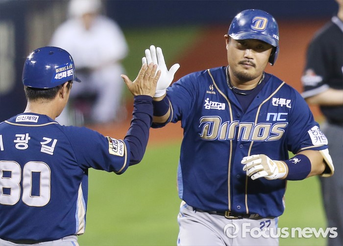 (서울=포커스뉴스) 29일 서울 잠실구장에서 열린 2016 프로야구 NC-두산 경기 6회초 1사후 NC 이호준이 중월 3점 홈런을 치고 3루를 돌며 이광길 코치와 하이파이브하고 있다.