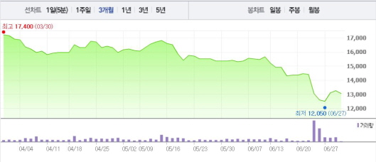 검찰이 FNC엔터에 대해 압수수색을 실시했다는 소식이 알려진 23일(종가 1만3050원) 이후 FNC엔터의 주가는 급락했다. 27일에는 52주 최저가를 경신하며 1만2050원을 기록하기도 했다.