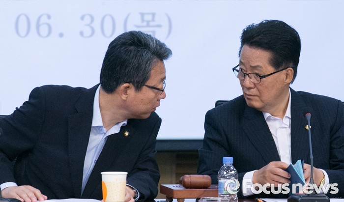 (서울=포커스뉴스) 30일 오전 서울 여의도 국회 의원회관에서 열린 국민의당 의원총회에 참석한 박지원(오른쪽) 비대위원장과 김성식 정책위의장이 대화하고 있다.