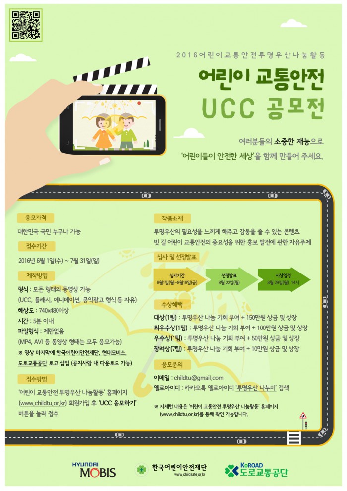 공모전의 주제는 투명우산의 필요성과 빗길 어린이 교통안전이다. 우리나라 국민이라면 누구나 참가 가능하며 5분 이내의 UCC 영상을 제작해 ‘어린이 교통안전 투명우산 나눔활동’ 홈페이지에 접수·제출하면 된다. MP4, AVI 등 파일형식의 제한은 없다.