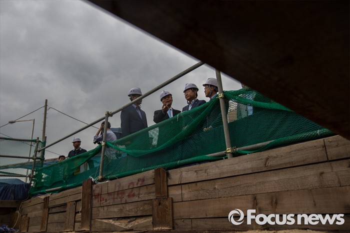(서울=포커스뉴스) 김종인 더불어민주당 비상대책위 대표가 30일 오전 서울 용산구 한강로 빗물펌프장을 방문해 공사현장을 둘러 보고 있다.