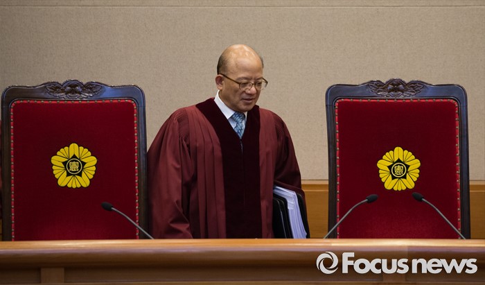 (서울=포커스뉴스) 30일 오후 서울 종로구 헌법재판소 대심판정에서 박한철 헌법재판소장이 '언론인 선거운동 금지' 공직선거법 제1항 제5호 위헌법률심판 사건 선고를 위해 입장하고 있다.