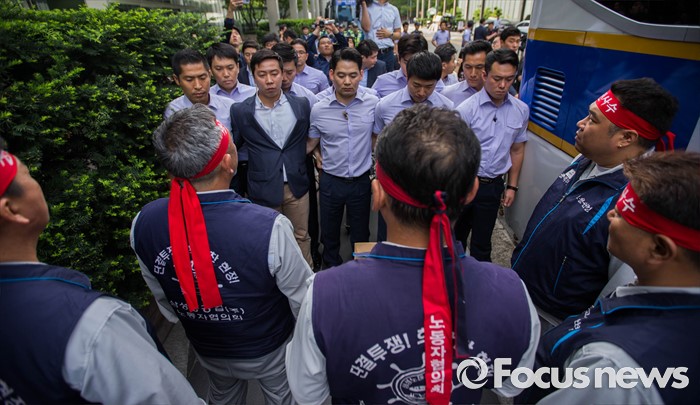 노조 관계자는 "노조도 국민의 여론을 잘 알고 있고 무시할 순 없다. 파업을 무작정 실행하겠다고 결의를 한 것은 아니다“라면서 ”우선 노조는 회사 측과 채권단, 정부와의 대화를 통해 문제를 해결하고 싶다. 진정성 있는 대화를 요구하는 것 뿐“이라고 말했다.(서울=포커스뉴스) 29일 오전 서울 서초구 삼성 사옥 앞에서 삼성중공업 노동협의회 관계자들이 구조조정에 반대하는 항의서한을 삼성 측에 전달하기 위해 삼성의 보안요원들과 대치하고 있다. 삼성중공업은 지난 15일 임원들의 임금 반납, 희망퇴직 등이 포함된 구조조정안을 공개했으며 올해 약 1500명 규모의 희망퇴직을 단행할 계획이라 밝혔다. 2016.06.29 성동훈 기자